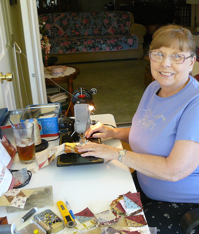 I worked on my "Gone to Texas" quilt. Of course, I brought my Featherweight machine to sew on. It is so easy to carry around and sews like a dream. Love continued to work on lap quilts for the nursing home that her church plans to give for Christmas. She is a little camera shy, so I don't have a picture of her.